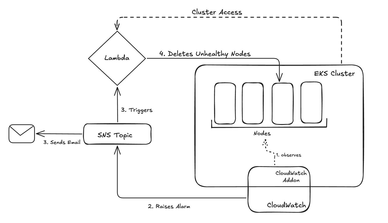| Mechanism | CloudWatch alarm notifies humans via SNS email. | CloudWatch alarm triggers Lambda to programmatically fix the node. | Karpenter controller detects and replaces unhealthy nodes in-cluster. |