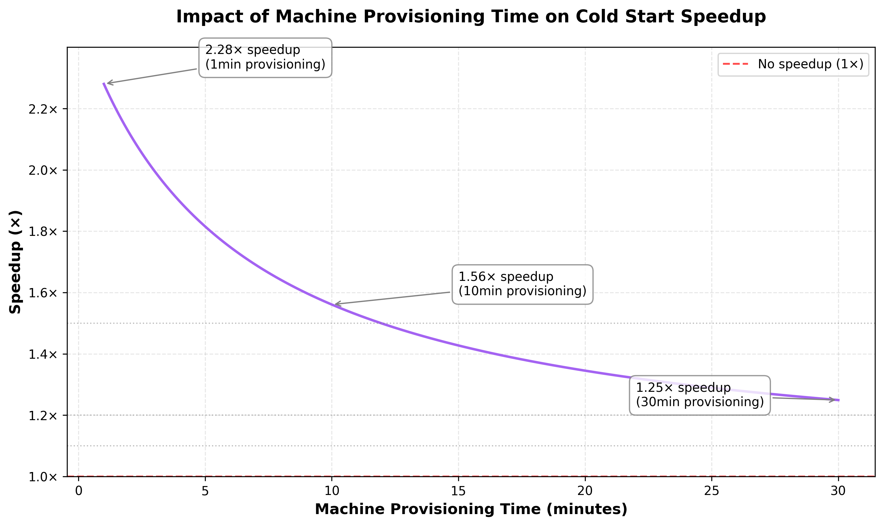 As AI/ML workloads need to download large models, decompress them, load them into GPU memory and do model compilation, they realistically take several minutes to start up—i.e., on the same order of magnitude as the container startup time. Let’s consider a case where lazy loading should benefit by a large margin. Say the overlayfs container startup time is 10 mins, and lazy container startup time is 1 sec Let’s look at the following graph to understand how this affects the speedup.