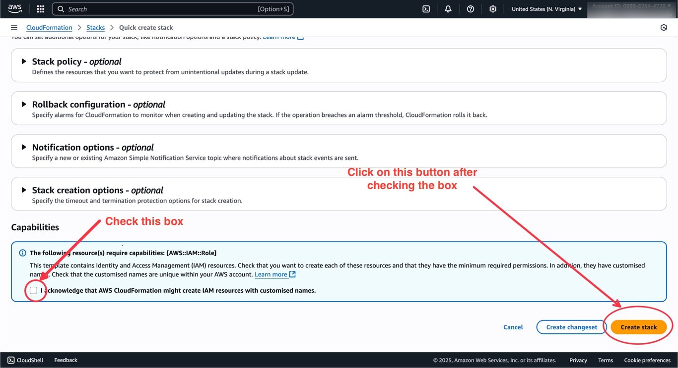 This will take you to your AWS console to create a permission stack. Scroll down to the bottom of the page, click on the checkbox, and click on the Create Stack button.