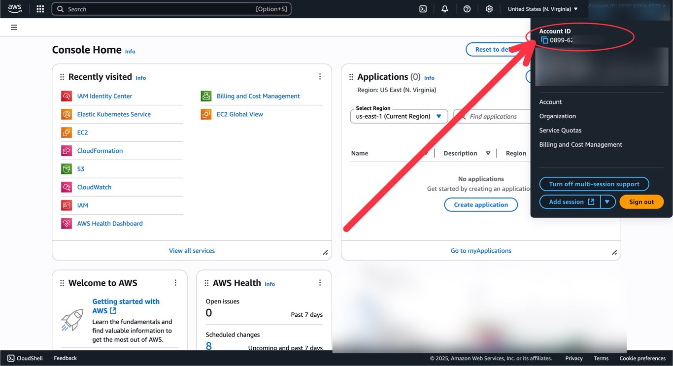 For the next step, we need to grant permissions to Tensorfuse to create resources on your behalf. For this, we need to know your AWS account ID. You can find that in the top right corner of your AWS console.
